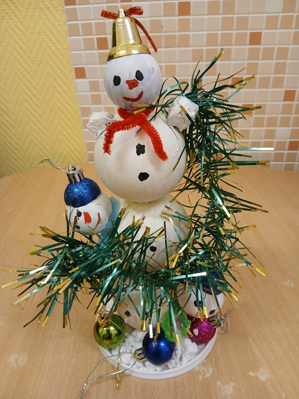 снеговики сделаны из шариков, которые покрашены белой краской, глаза и рот нарисованы черным и красным фломастером, украшены новогодними игрушками и дождиком.