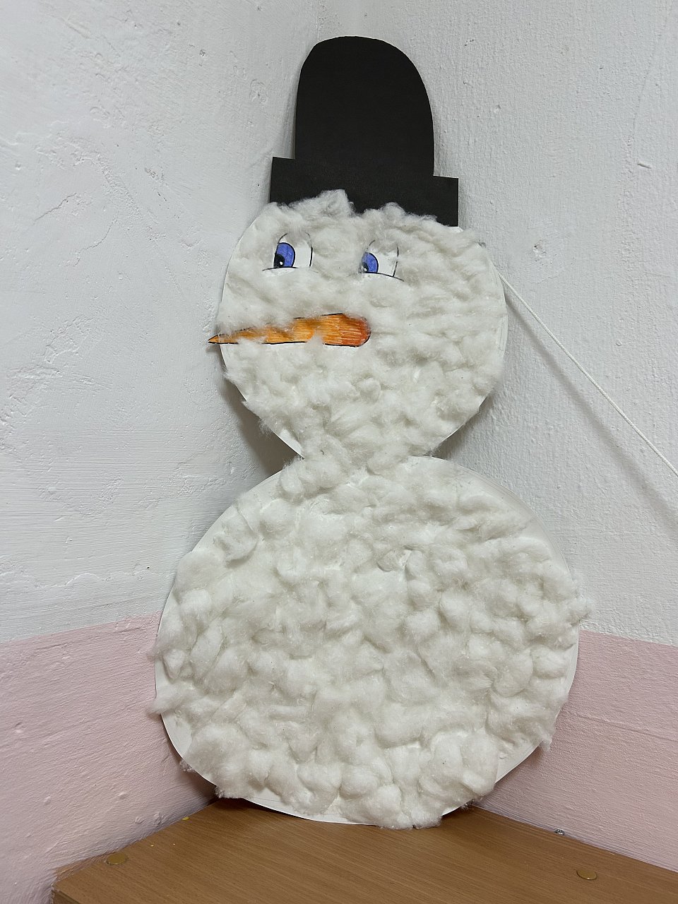 Участнику 2 года, использовали технику аппликации, для снеговика потребовался картон, клей, вата