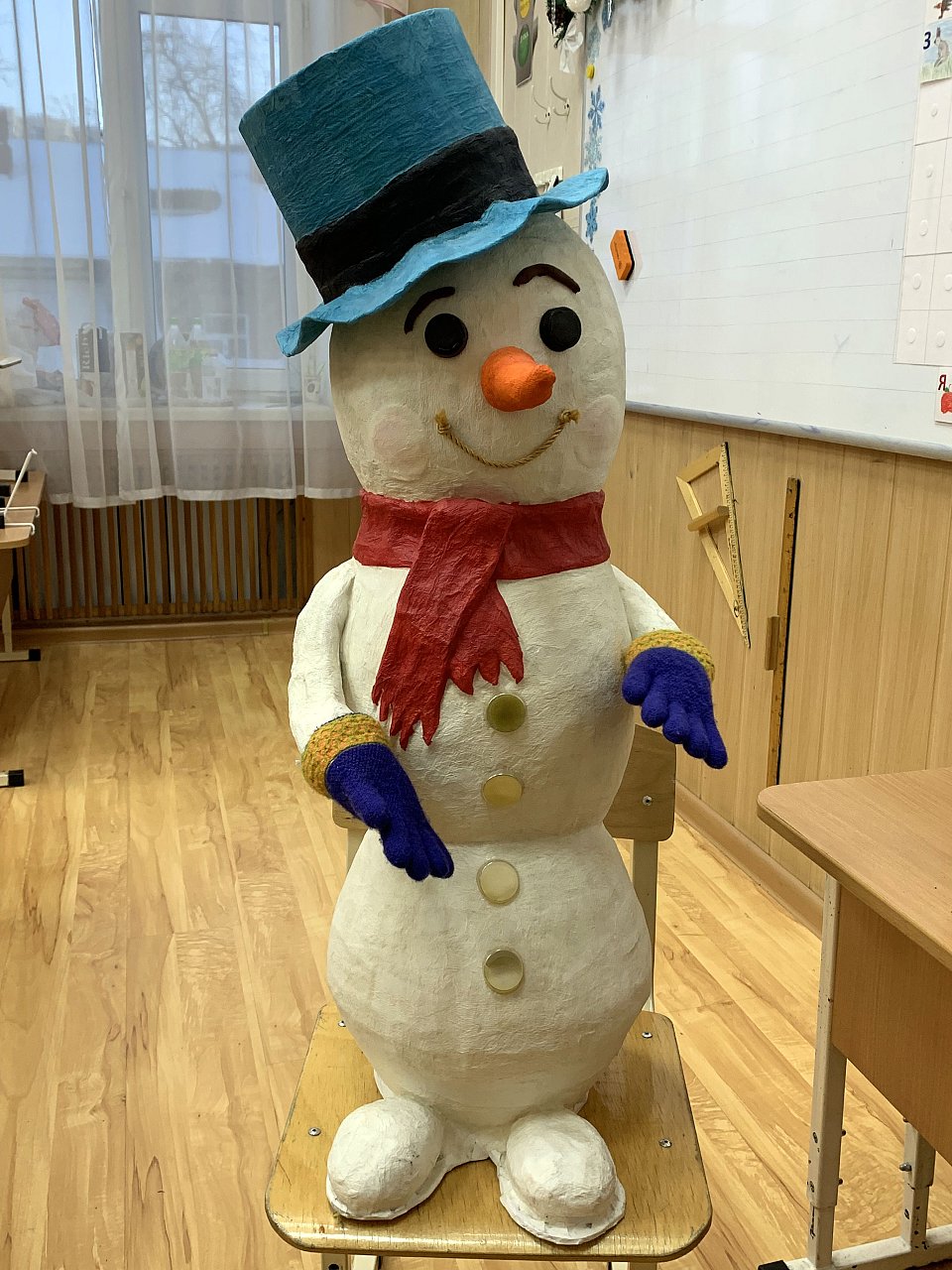 11 лет. Техника: папье-маше. материалы: воздушные шарики, клей ПВА, салфетки цветные, пластилин воздушный, акриловые краски, бечевка, коробка от цветов.
