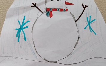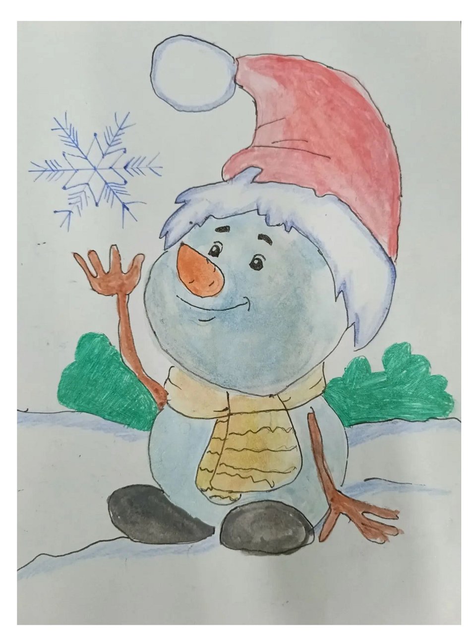 7 лет; рисунок; смешанная техника рисования; акварель, цветные карандаши и тушь; снеговик ловит снежинку