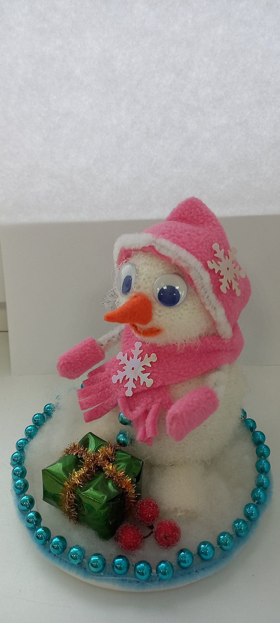 Доя работы использовала ткань,вату,бусины,фетр,снежинки,пластиковую основу.