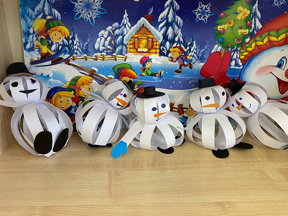 Работы учащихся 1 класса. Возраст детей 7,8 лет. Снеговики выполнены из бумажных полосок, которые склеены между собой.