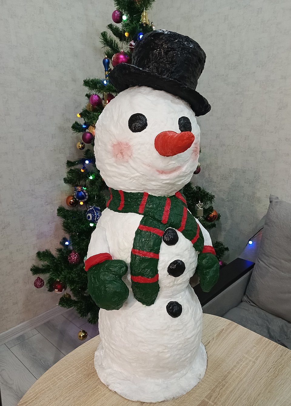 Работа выполнена в технике папье-маше. Некоторые детали сделаны из фольги. Поделка декорирована ватой и акриловой краской.
