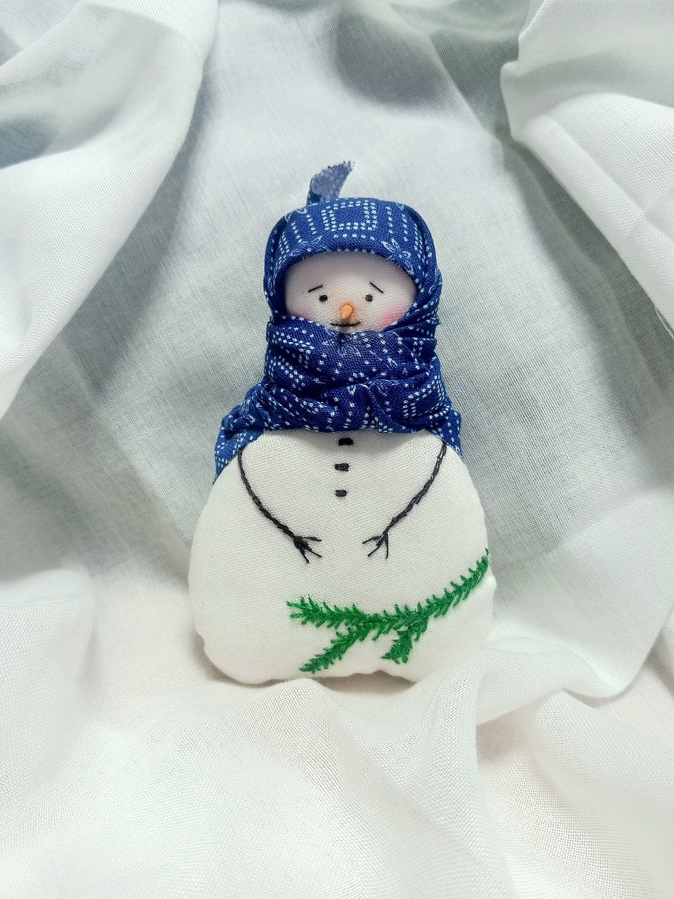 Возраст 11 лет, снеговик выполнен в текстильной технике с применением вышивки. Использованы ткань бязь, нитки мулине, наполнитель синтепух.