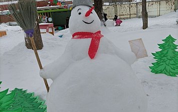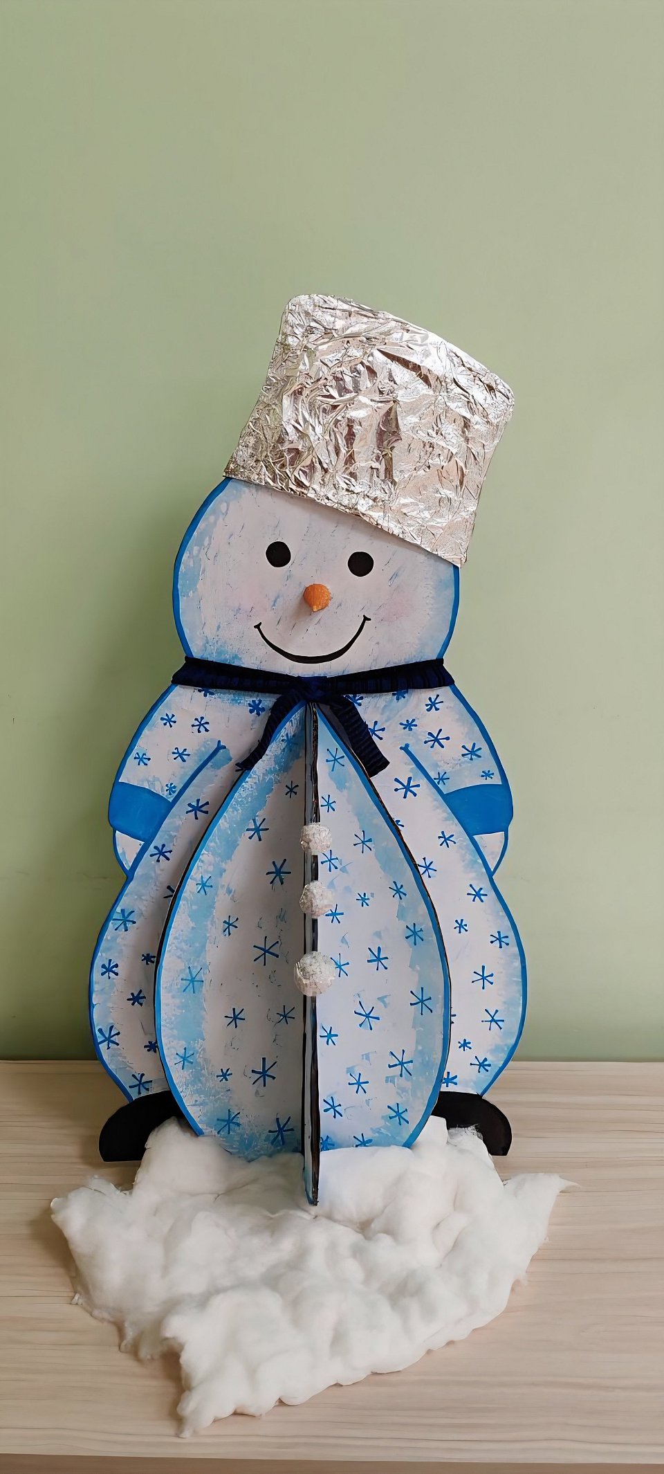 Большой объёмный снеговик выполнен воспитателем в технике конструирование из картона.