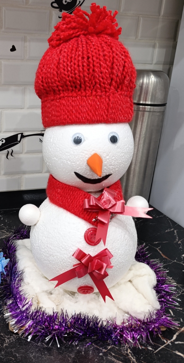 Шары из пенопласта, вязальные нитки, мишура.