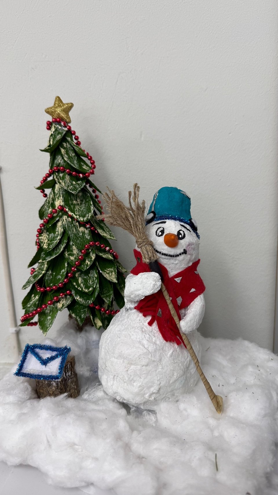 Снеговик изготовлен в технике ватная игрушка, елка из бумаги