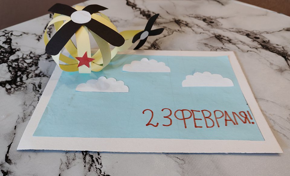 Работы выполнена из цветной бумаги, клея и картона. Для заготовок использовались 5 полос 1 ×25см, 8 лопастей для хвоста и винта вертолёта, облака и звезда для украшения вертолёта.