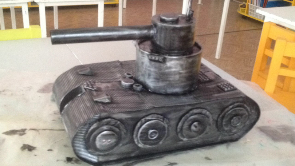 работа выполнена из гофрокартона и коробок, а также использовала пуговицы , Лего и гуашь