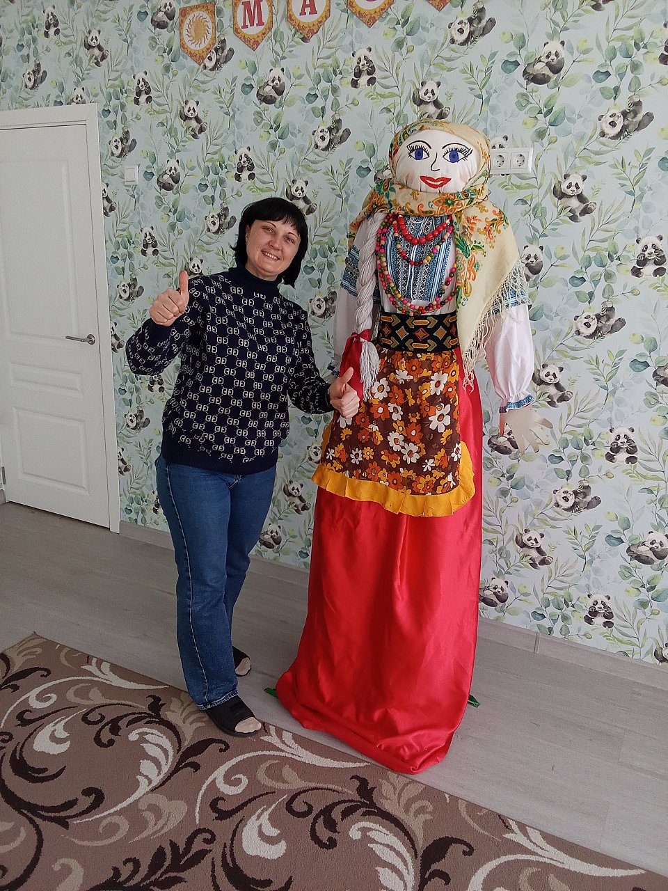 Воспитатель ДОО, в технике народной куклы: солома , ткань нитки, деревянные бруски, фломастер, картон.