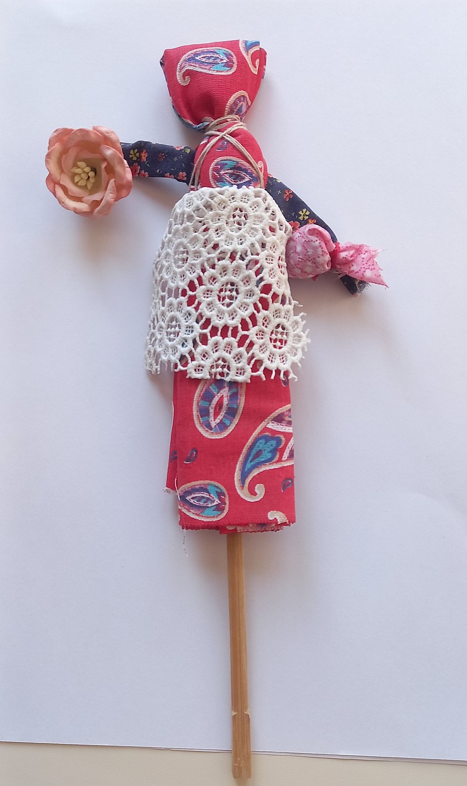 Изготовлена из ласкутков ткани без использования иголки, только путем переваривания нитками. Одежда выполнена из цветной ткани и украшена белым кружевные фартуком. В руках у куклы узелок с семенами и декоративный цветок. Кукла изготавливается на масленицу и служит оберегом целый год.
