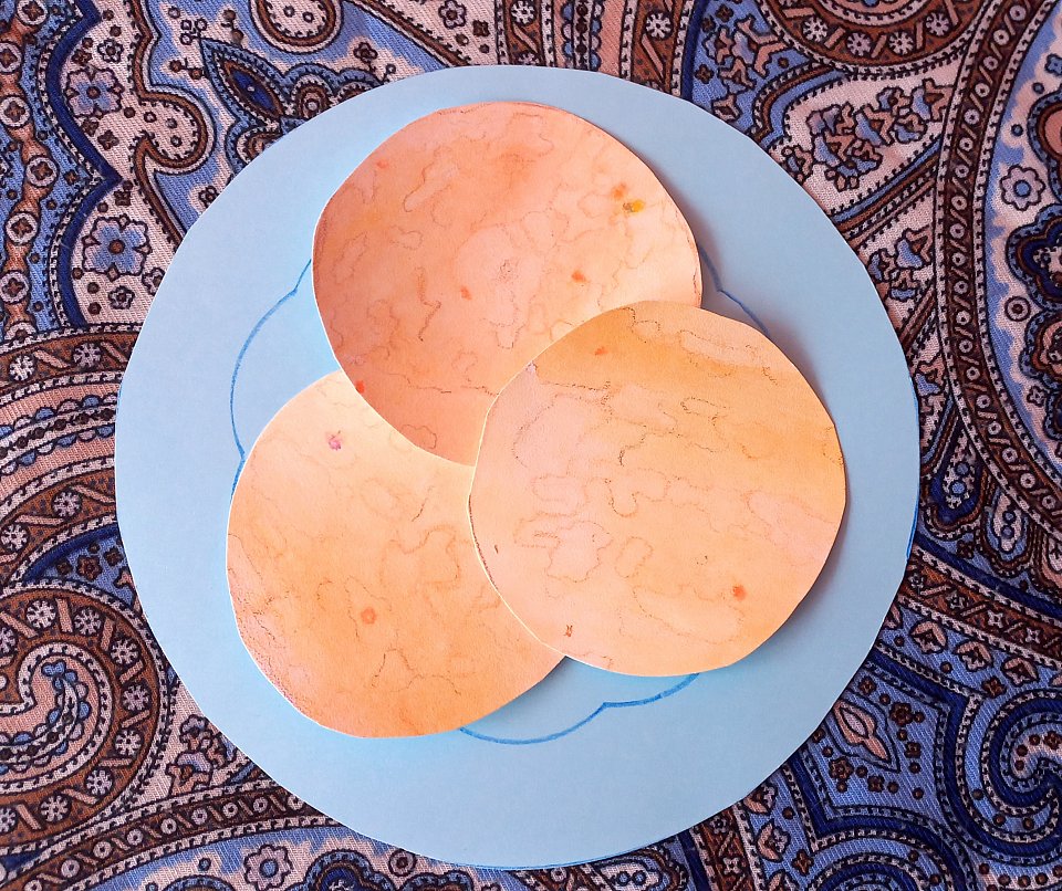 Работа выполнена воспитанницей группы компенсирующей направленности 5 лет. Материалы: тонированная при помощи акварельных карандашей и влажной губки акварельная бумага, цветной картон