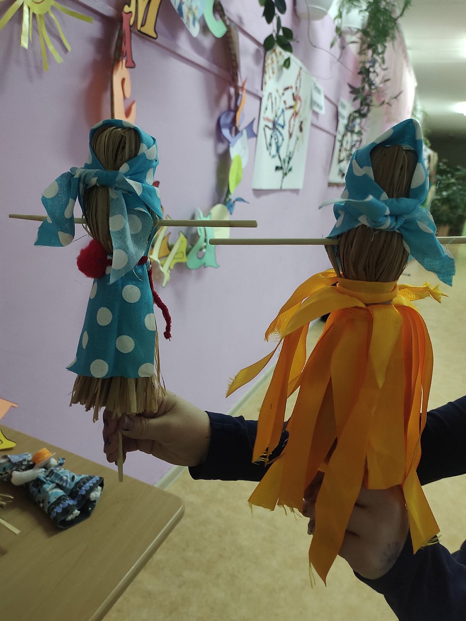 Дарья- 9 лет, Карина- 8 лет . Куклы выполнены их бросового материала: сухая трава - основа, руки -палочка, костюм- ткань.