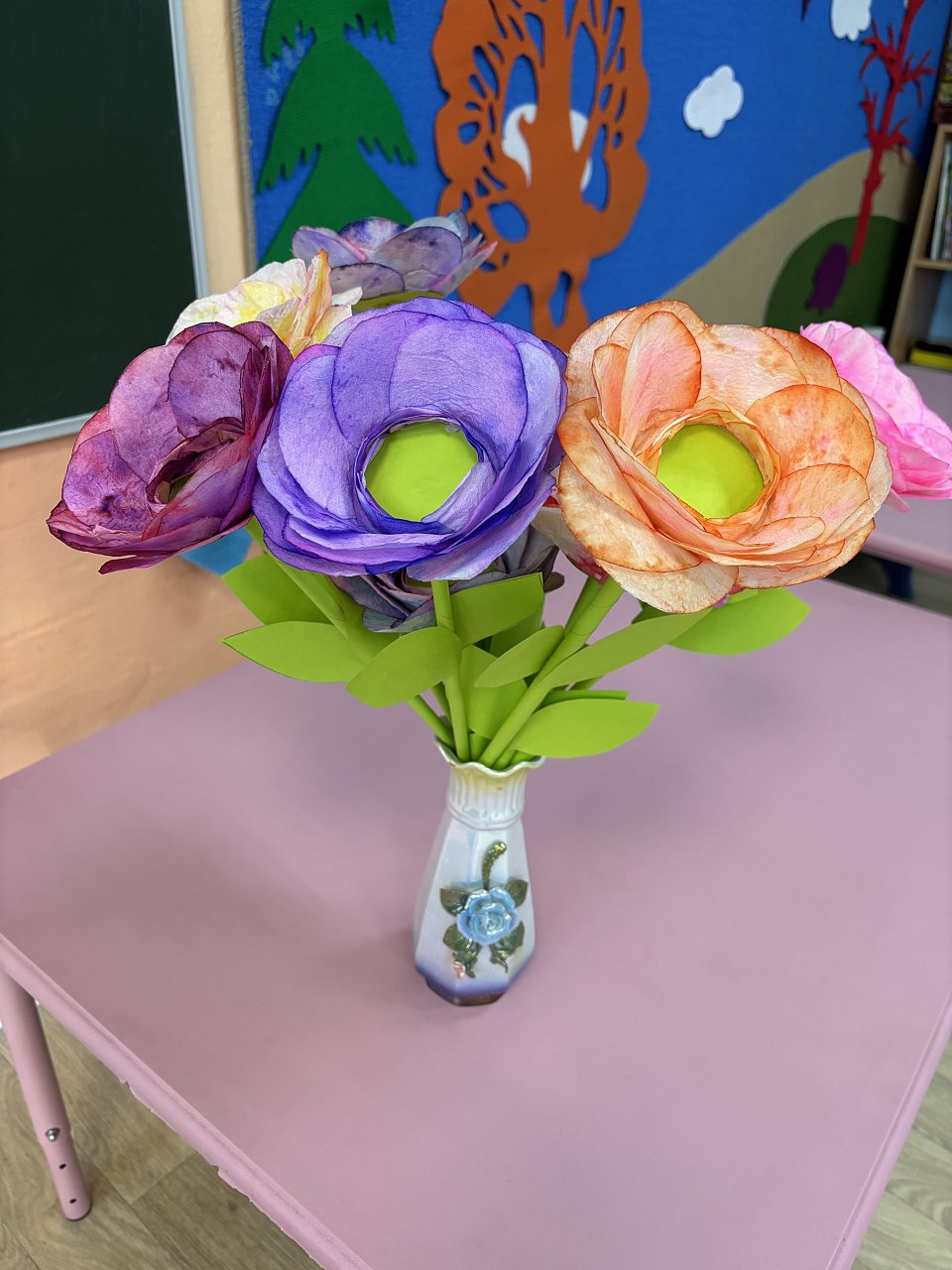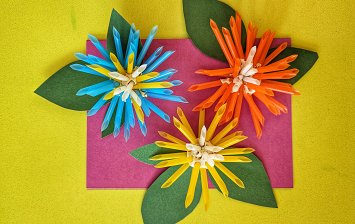 Участники 5-6 лет, работа выполнена в технике бумажной пластики, использовались салфетки, цветная бумага, фломастеры, вода