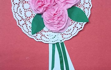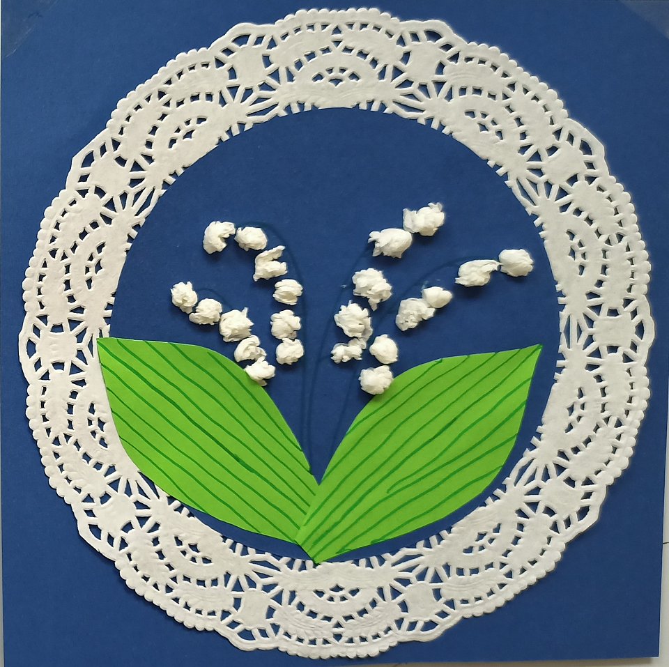 4 года. Работа выполнена из бумажных и ажурных салфеток, цветной бумаги в технике: аппликация из бумажных комочков, аппликация из готовых форм с элементами рисования.