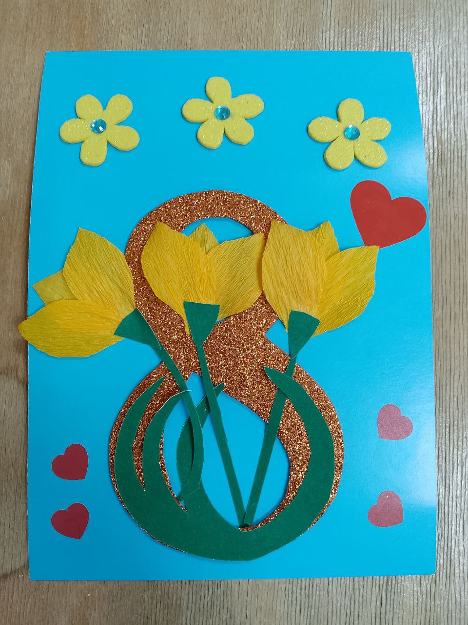 Работа выполнена в технике аппликации, с применением объемных и необычных материалов