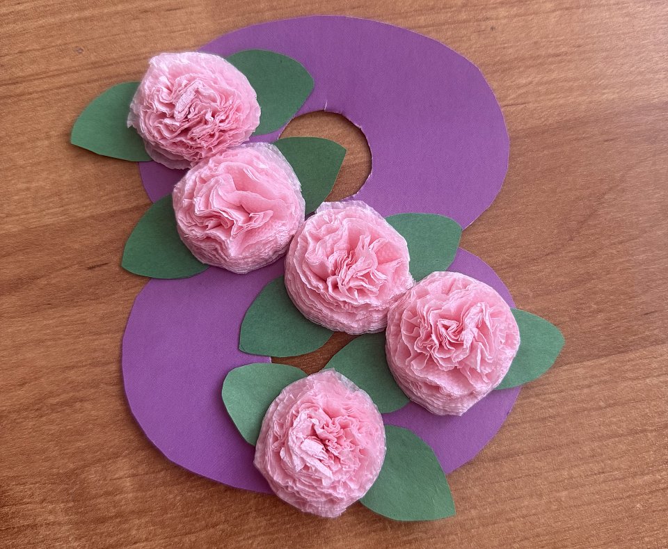 Работа сделана в несколько этапов. Сначала были сделаны цветы из салфеток. На салфетках рисуем 5 кругов и каждый по середине скрепляем степлером, затем вырезаем их и каждый слой "мнём" к серединке, в конце немного расправляем и получаем розочку. Когда цветы готовы, из бумаги нужно вырезать листики и приклеить к каждой розе. После этого из картона вырезаем цифру 8. Розочки с листьями приклеиваем к цифре и "Подарок любимой маме" готов.