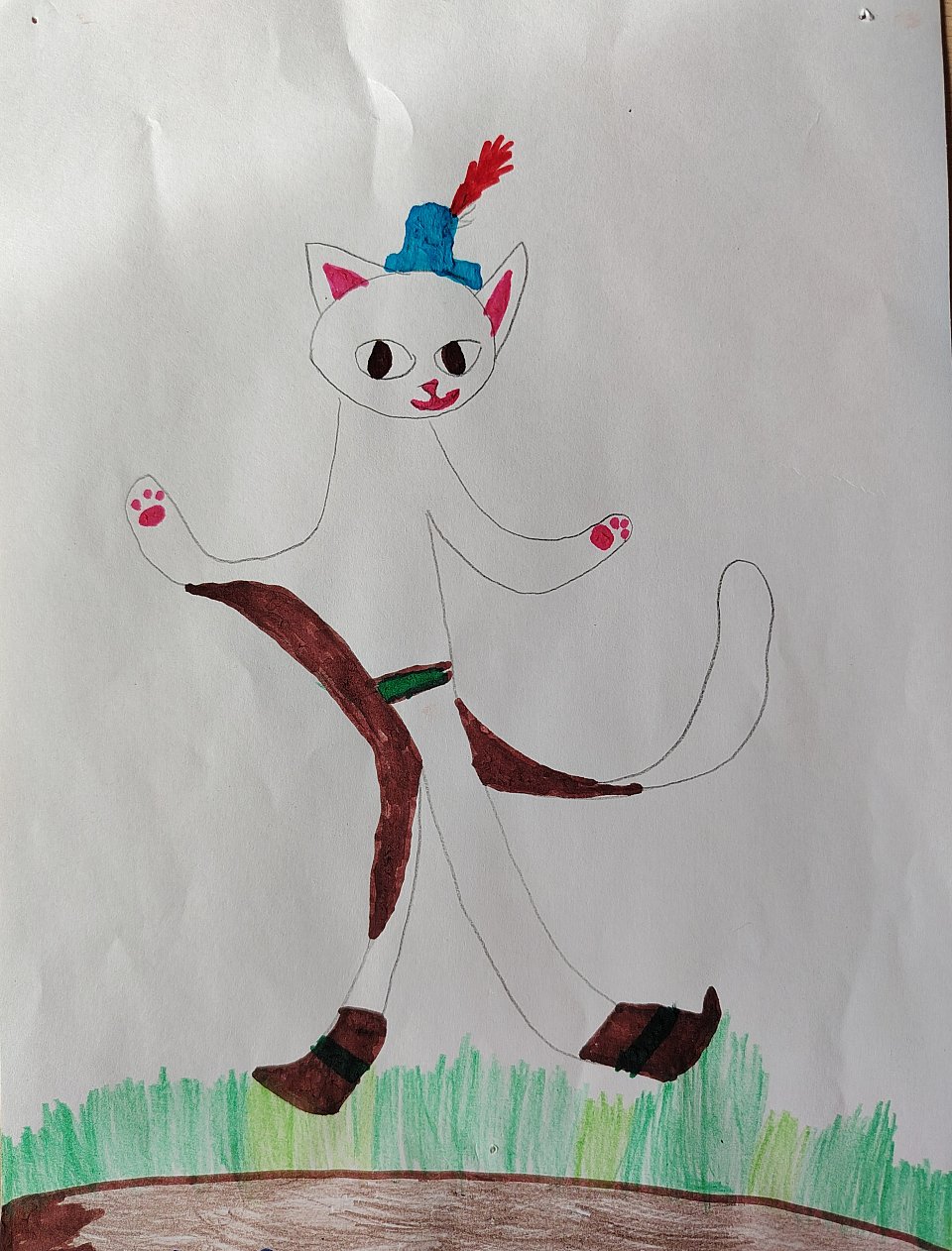 Рисунок по сказке Шарля Перро "Кот в сапогах", фломастеры и карандаши