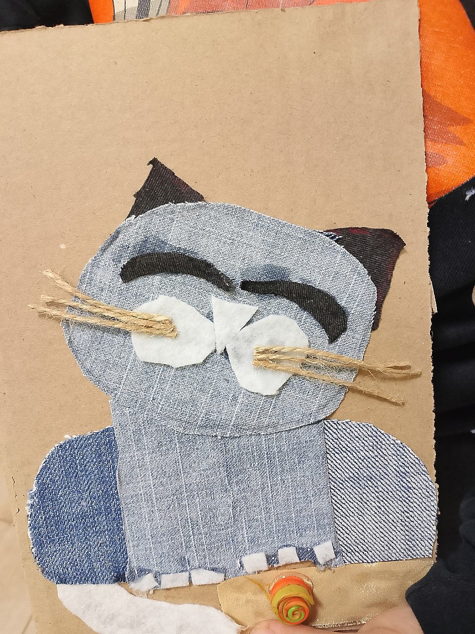 Джинсы разных оттенков, фетр, ткань, джут, бусина, гофрокартон, полимерный клей