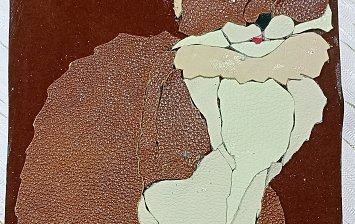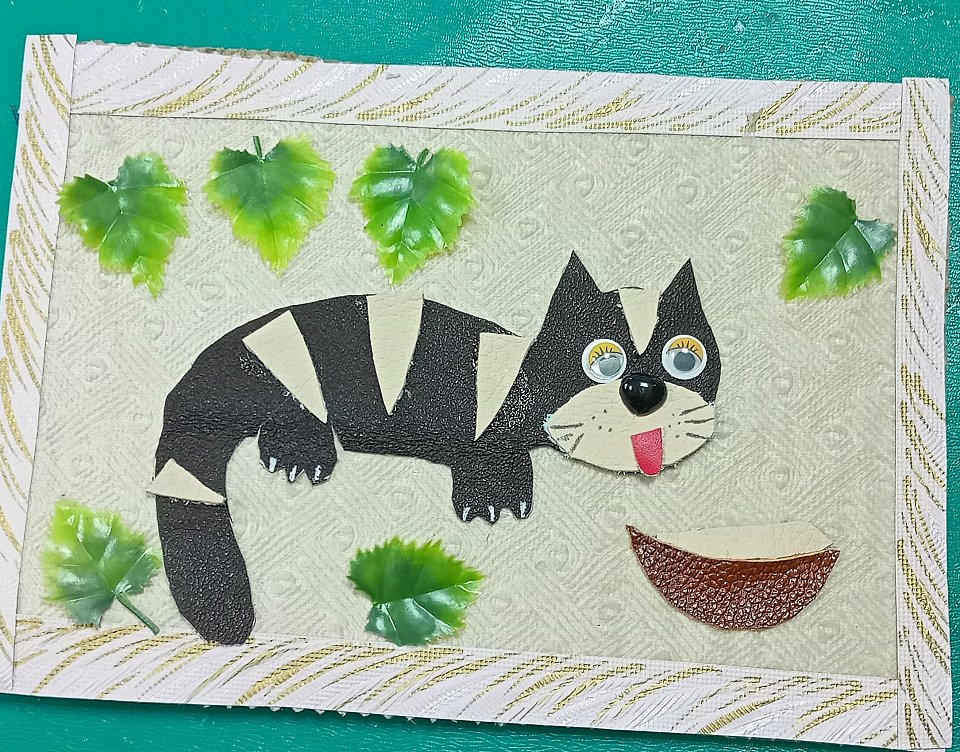 11 лет, картина из кожи, обои, картон, пластиковые листы и глазки, кожа,клей.