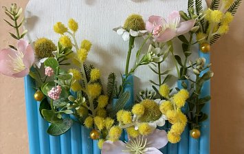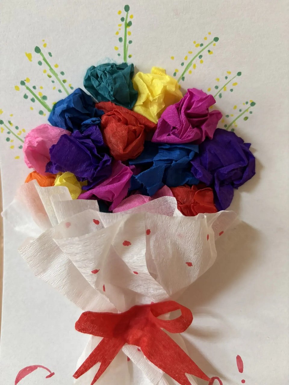 Работа выполнена дошкольником ( 3 года ) при поддержке воспитателя. Использованные материалы - салфетка, цветная бумага, картон, лента, акварель.