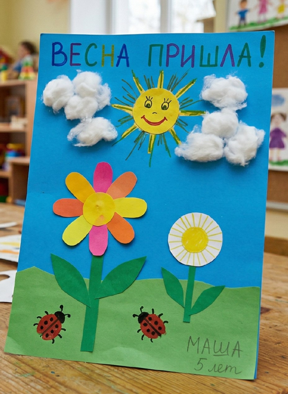 Ребенок самостоятельно сделал поделку из бумаги, картона, ваты. Также брал гуашь для рисунка, фломастеры для надписи. Буквы написаны с помощью шаблонов и линейки.