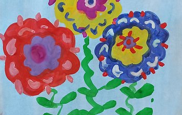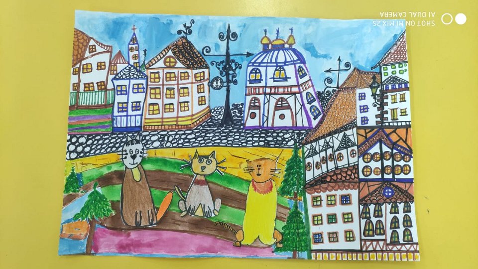 Материал: краски гуашь, Фломастеры, белая бумага, клей карандаш. Техника исполнения картины: Декупаж.