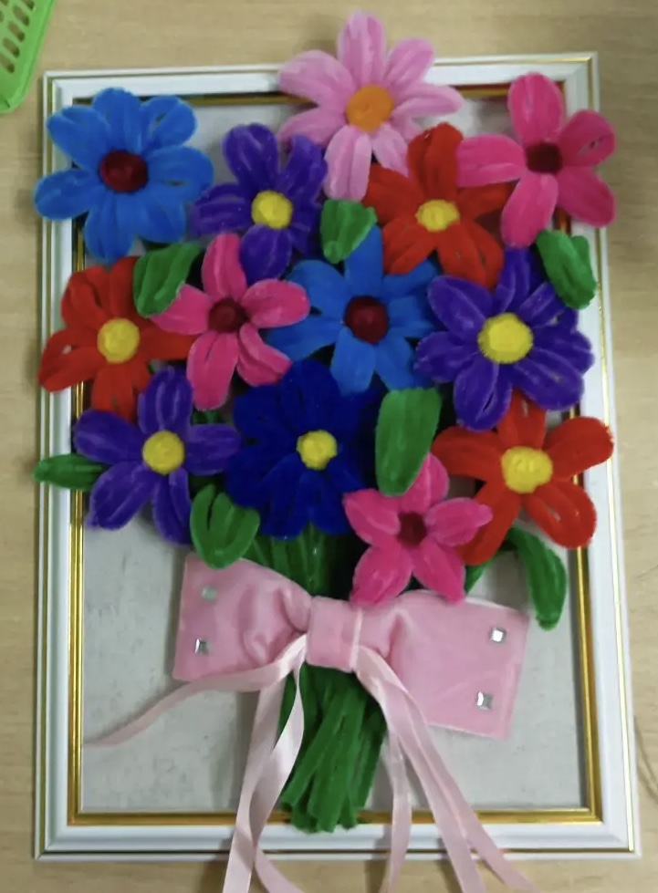 9 лет, декоративно-прикладное творчество, раздел - цветоделие, использовались: синельная проволока, клей, ножницы, картон