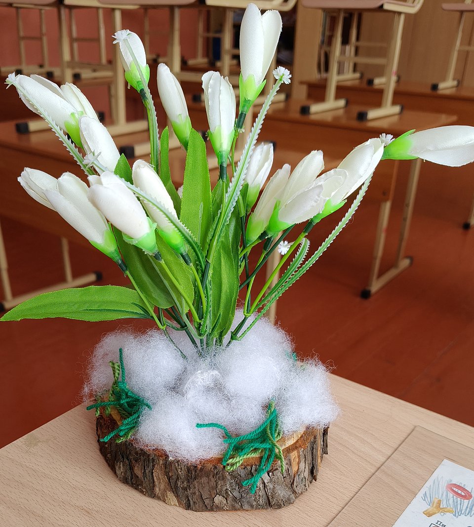 Возраст 11 лет, Техника исполнения : из деревянного спила и искусственных цветов. Материалы : деревянный спил, искусственные цветы, синтепон, пряжа, клей.