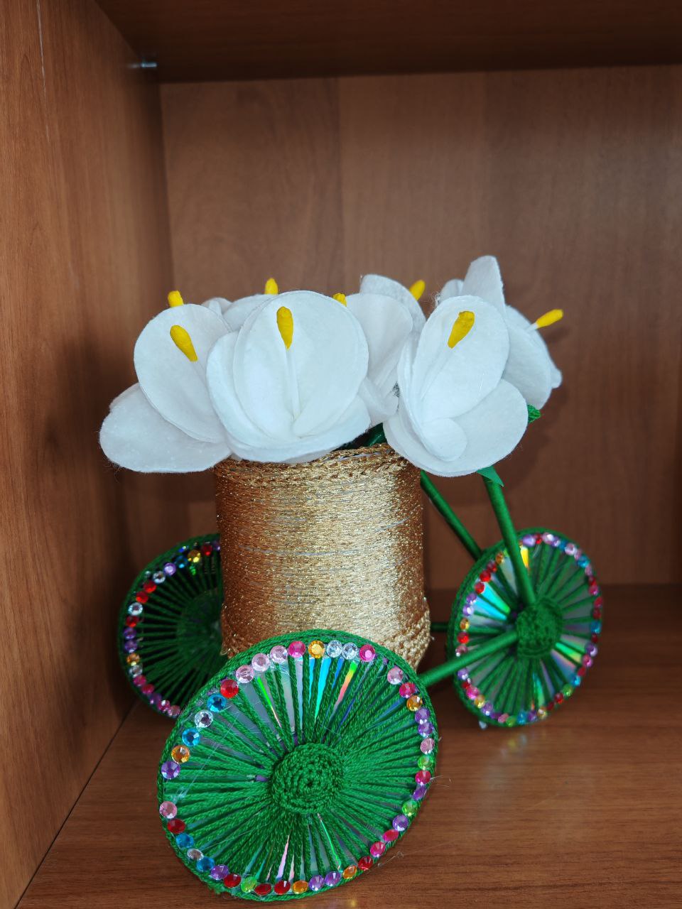 9 лет, поделка выполнена из дисков, нитей, ватных дисков, проволоки