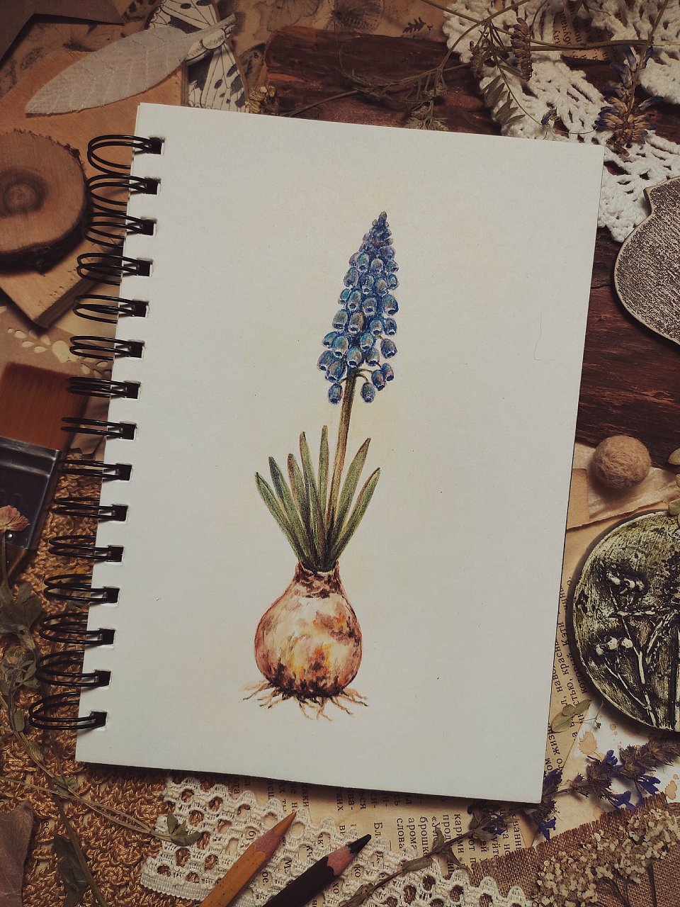 На рисунке акварельными карандашами весенний цветок - мускари.