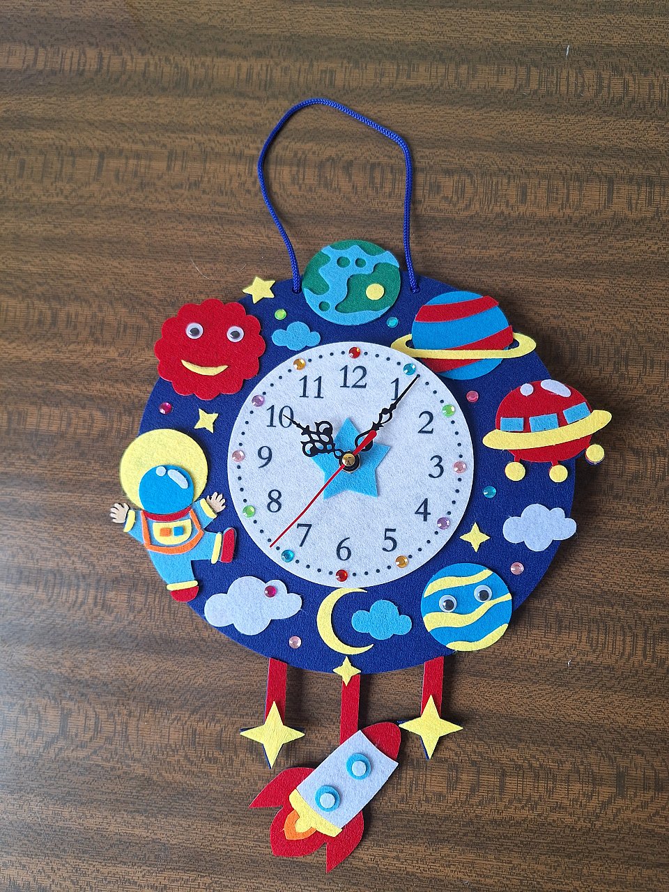 Фетр разных цветов, циферблат на бумажной основе, клей, настоящий часовой механизм,верёвка для крепления. Для украшения стразы на клейкой основе.