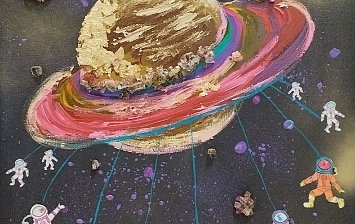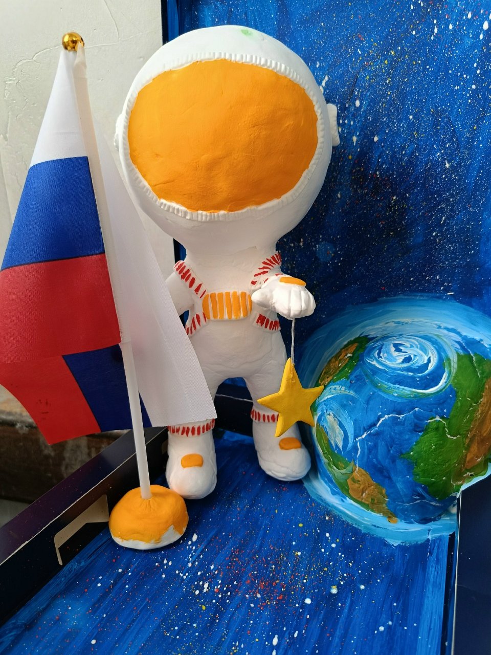 Поделка выполнена участником в возрасте 6 лет. Представляет собой композицию из трёх основных элементов: фигуры космонавта, флага России и модели планеты Земля. Для создания работы были использованы следующие материалы: масса для лепки (белый, оранжевый, красный цвета) для фигуры космонавта, цветная бумага (белый, синий, красный цвета) и палочка (например, от мороженого или шпажка) для древка — для флага России, пластилин (синий, зелёный, коричневый цвета) и картон как основа для формы планеты — для модели Земли. Также применялись акриловая или гуашь краска для фона (имитация космоса — синий цвет с белыми точками-звёздами), золотистая звезда (может быть сделана из пластилина, фоамирана или вырезана из цветной бумаги и покрыта глиттером), клей ПВА или пластилиновый «шарнир» для крепления элементов, а также основа (картон или деревянная панель) для композиции. Техника выполнения включала следующие этапы: сначала были вылеплены отдельные детали фигуры космонавта (голова, туловище, руки, ноги) из белого пластилина, затем добавлены акценты (оранжевые элементы на шлеме, поясе, ботинках; красные полосы на костюме), после чего детали были соединены, и фигура установлена на основу. Для изготовления флага были вырезаны три полосы из цветной бумаги (белая, синяя, красная) и наклеены на прямоугольную основу, после чего было прикреплено древко из палочки. Модель Земли была создана на круглой основе (картон или пластилиновая заготовка) с вылепленными участками суши (зелёные и коричневые) и океанов (синие), детали были проработаны для создания эффекта рельефа. Фон был оформлен путём окрашивания картона или панели в синий цвет с имитацией звёзд белыми точками. Все элементы были закреплены на общей основе, и в завершение была добавлена золотистая звезда как декоративный элемент. Поделка сочетает лепку, аппликацию и рисование, использует яркие, контрастные цвета и продумана с учётом баланса элементов (космонавт, флаг, Земля). Работа выполнена с применением базовых техник рукоделия, доступных ребёнку 6 лет, с помощью простых и безопасных материалов, и способствует развитию мелкой моторики, воображения и интереса к теме космоса.