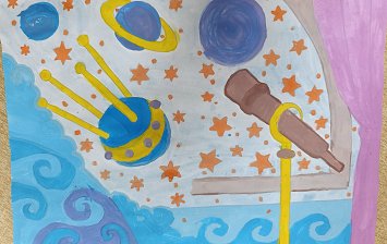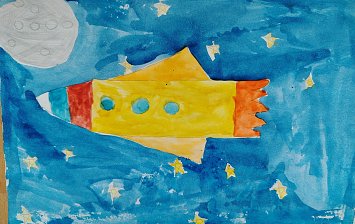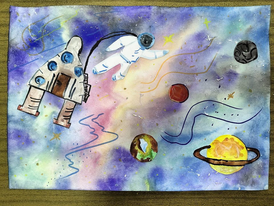 Детали акварелью нарисованы, выстрижены и наклеены, элементы дорисованы фломастерами.