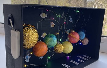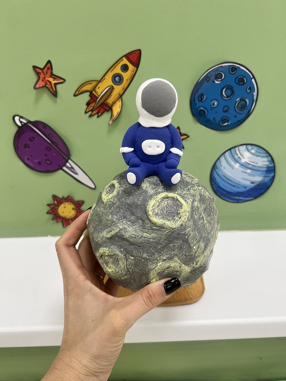 Луна из папье-маше, окраска акриловыми красками с помощью губки, космонавт из воздушного пластилина