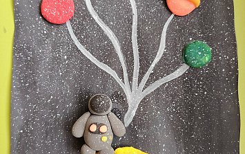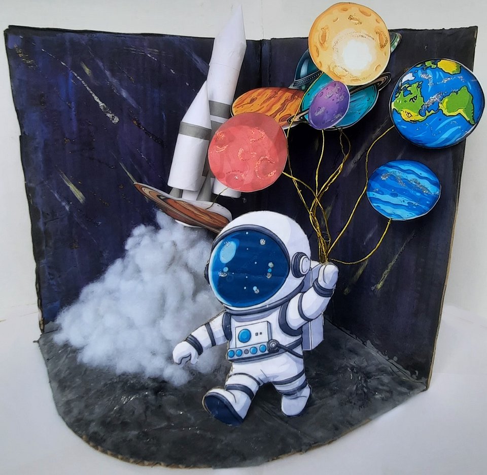 5 лет. Картон, гуашь, синтепон, модель космонавта, проволока, модель планет