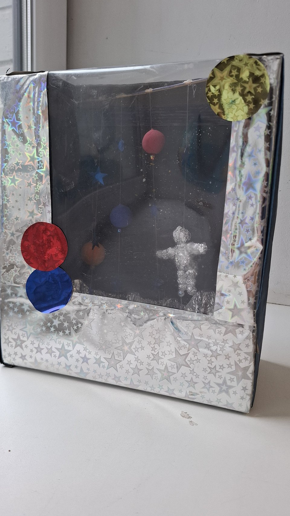 Объемная поделку с планетами и космонавтом можно назвать "Космонавт в космосе"