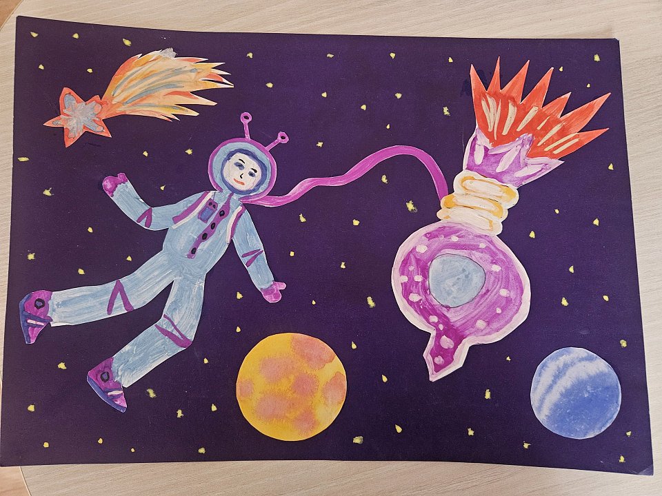 4 года. карандаши, краски. Ребёнок показывает космонавта,который совершает полёт рядом с планетами.