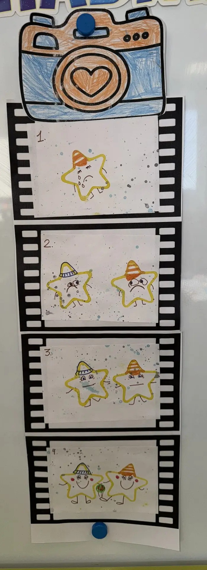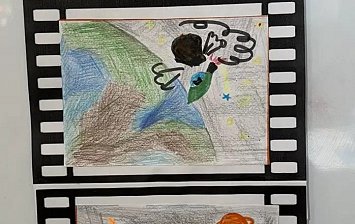 5 лет. Работа выполнена цветными карандашами, красками в технике раскадровки