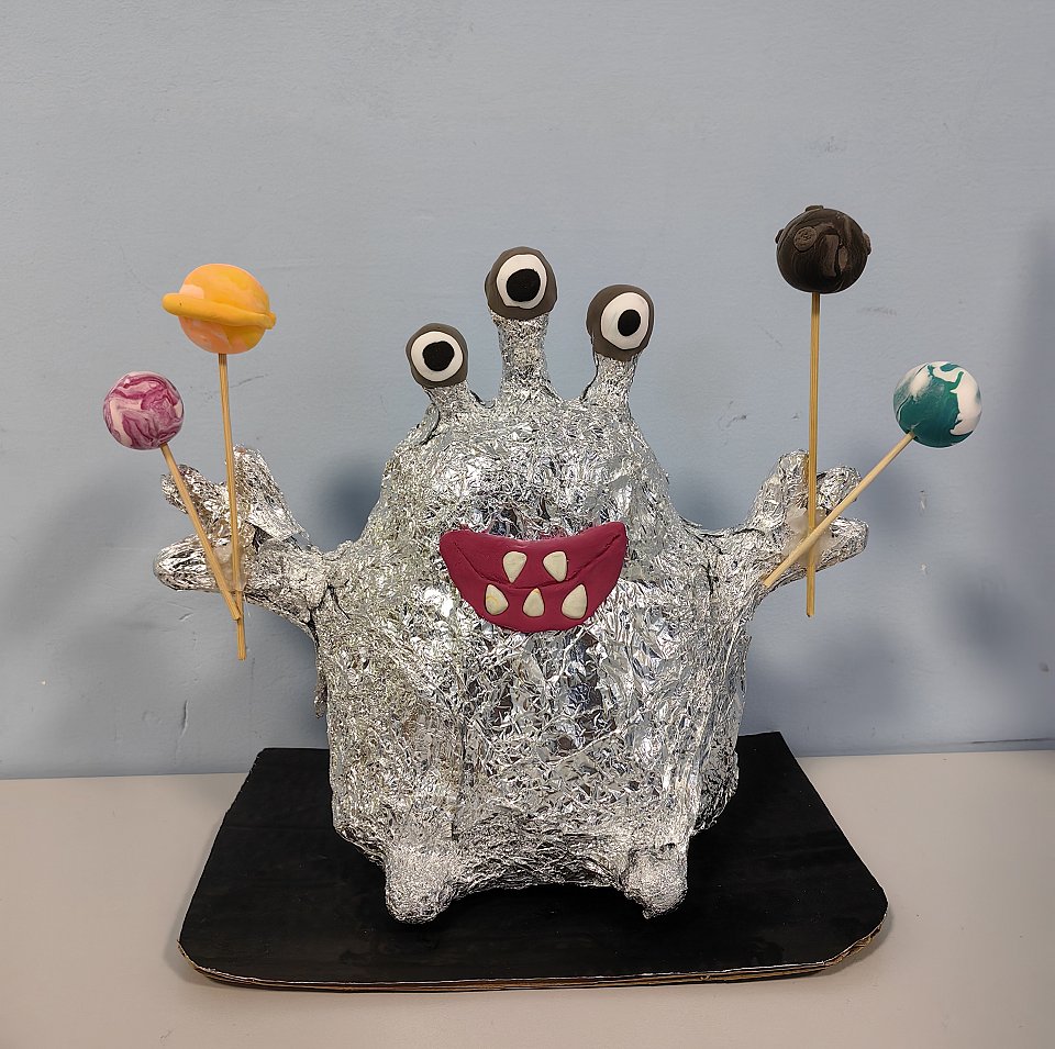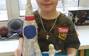 4 года, работа выполнена из бросового материала, использовалась коробка от техники,ненужная бумага, фольга и в помощь взят пластилин.