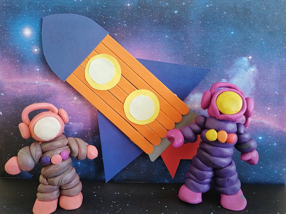 лепка из пластилина, цветной картон и бумага, деревянные палочки.
