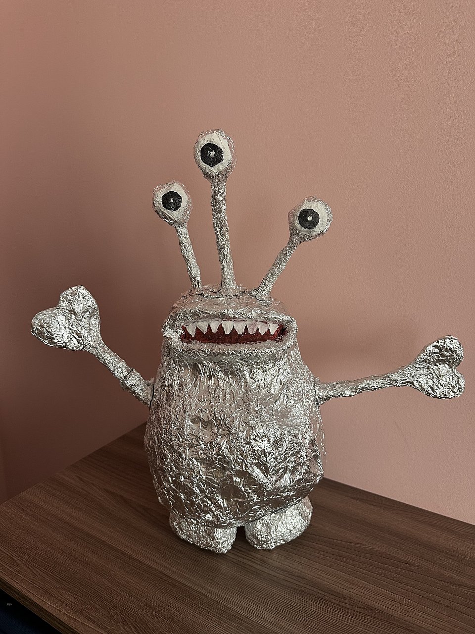 7 лет. Поделка сделана из таких материалов, как бумага, фольга, клей, скотч и краски.