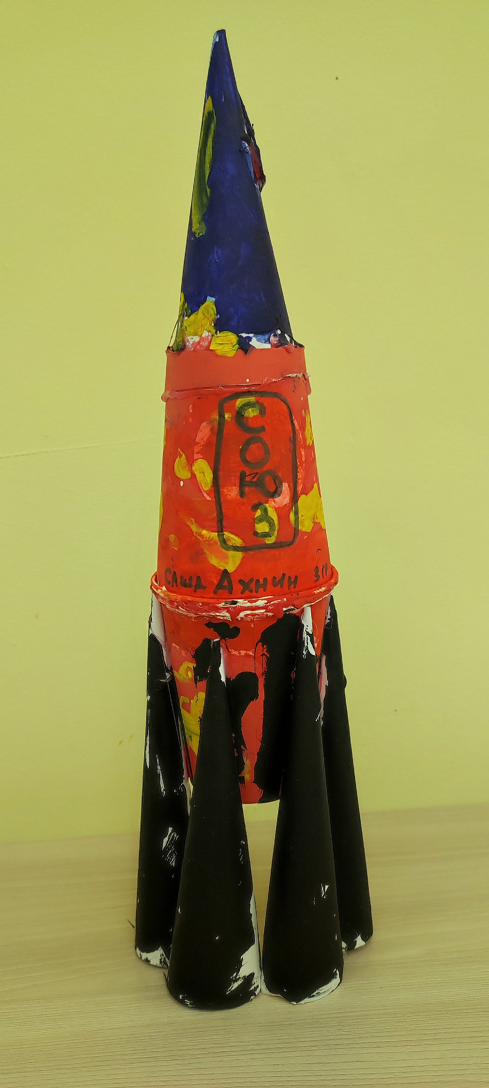 техника исполнения - подготовка корпуса, создание носового конуса, изготовление стабилизаторов, декорирование; использованные материалы - 2 одноразовых бумажных стаканчика, картон, клей-карандаш, гуашь, ножницы.