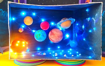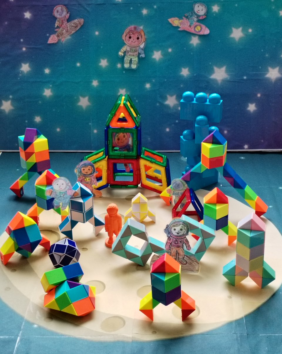 Макет выполнен детьми к Дню космонавтики. В его основе — ракеты, собранные из змейки Рубика. Каждый участник проявил фантазию, создавая уникальные по форме космические аппараты: от классических ракет до фантастических звездолётов будущего. Дети самостоятельно раскрасили и вырезали космонавтов, создав яркую сюжетную композицию