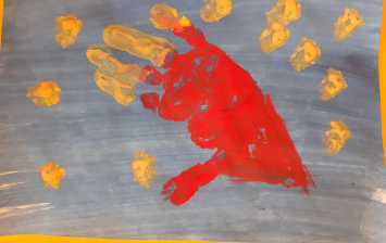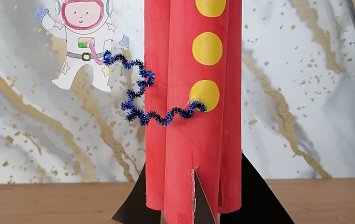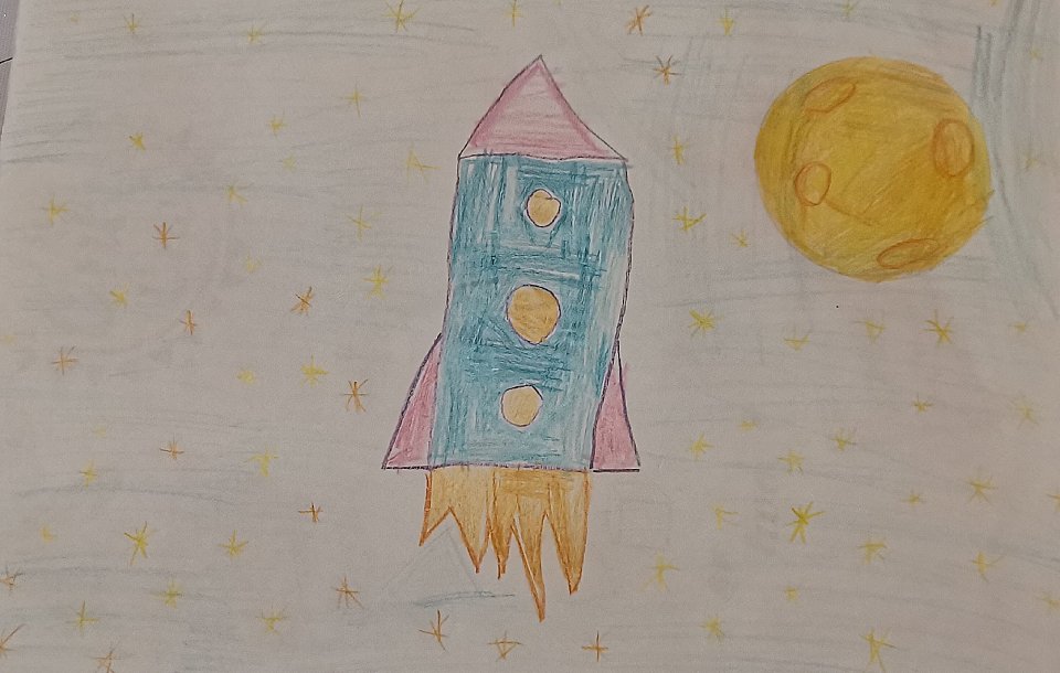 "Полёт на Луну" На рисунке изображена ракета, которая летит в космос. Работа выполнена карандашами