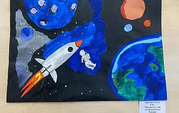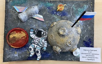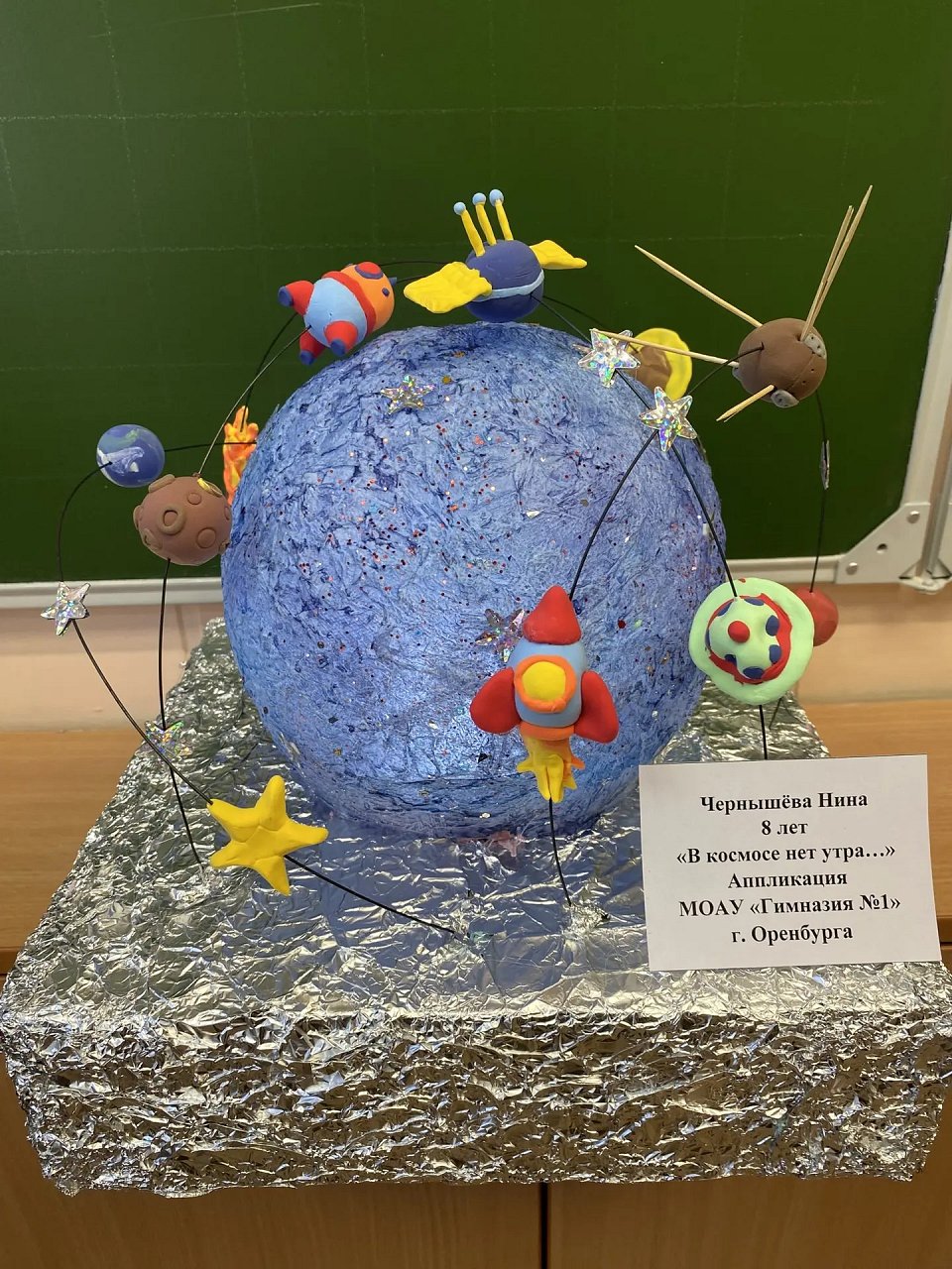 Работу выполняла девочка 8 лет. Аппликация. Техника исполнения: папье-маше (салфетки, пва клей, краски), космические объекты - воздушный пластилин, зубочистки, проволока, блестки, пайетки, клей пистолет, фольга, коробка для основания, светильник на батарейках.