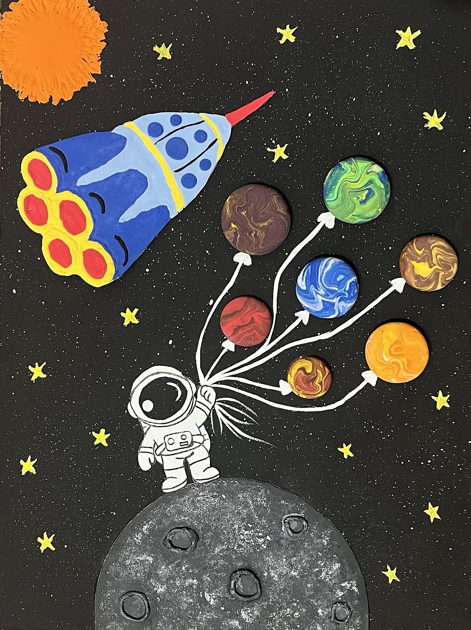 Объемная аппликация из воздушного пластилина на холсте, краски гуашь, черный маркер, клей