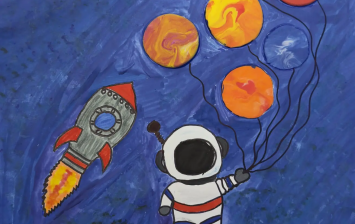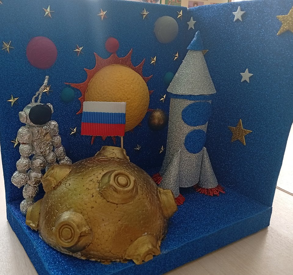 Работа выполнена в технике объёмной аппликации, с помощью разных материалов: пенопласт, фоамиран, фольга и картон.
