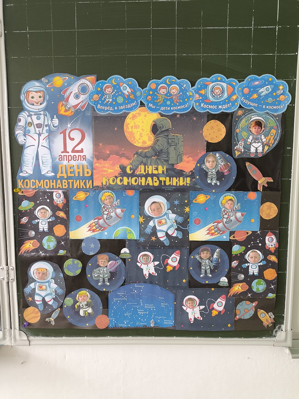 Учащиеся 3 класса, коллаж из фотографий и картинок о космосе.