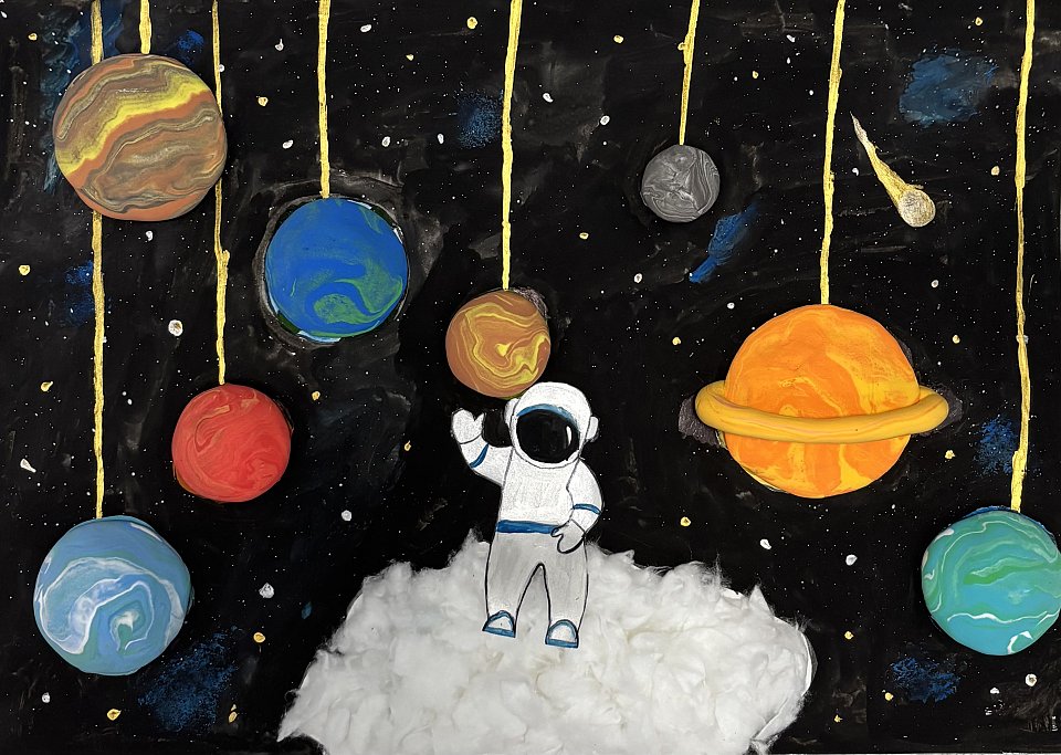 Работа выполнена в формате А3 с использованием гуаши. Планеты объёмные, выполнены из воздушного пластилина. Для создания облака использована вата.
